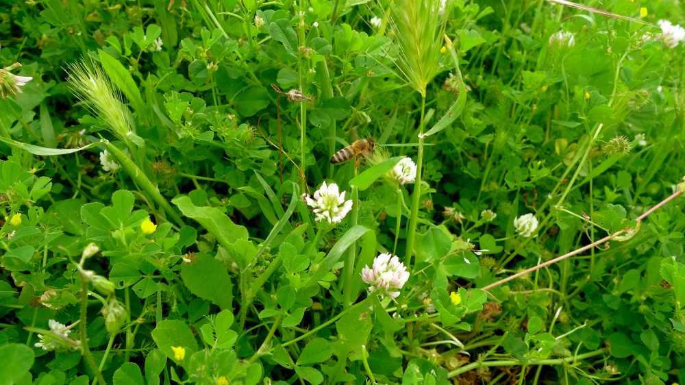 Below is a bee on an apple flower…unfortunately apple nectar is low in sugar for a spring blossom and not very attractive to bees. However, the pollen, which is a greenish to pale yellow colour, is useful.