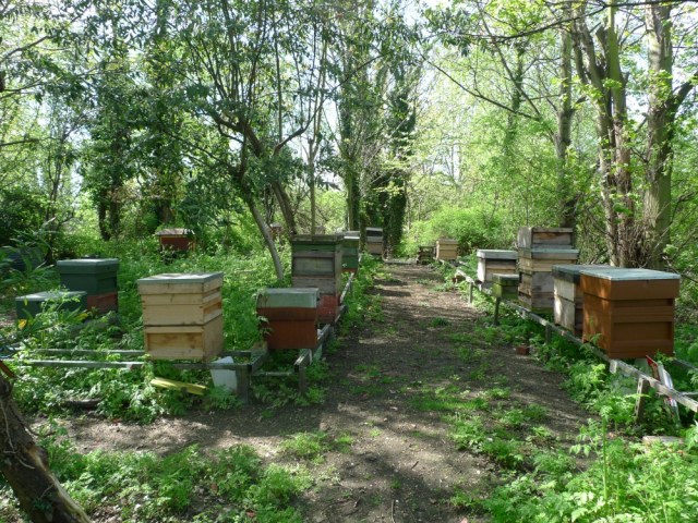 The apiary today. Mine is the second hive on the far right, next to the similarly sized chocolate brown hive.