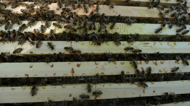 On the frame tops I saw some dots which I was worried at first might be dysentry, but looking closer they seem too reddy brown and the wrong texture for dysentry, so hopefully just propolis from their helpful attempts to stick down the queen excluder. Lots of hob-nobbing going on in this photo.