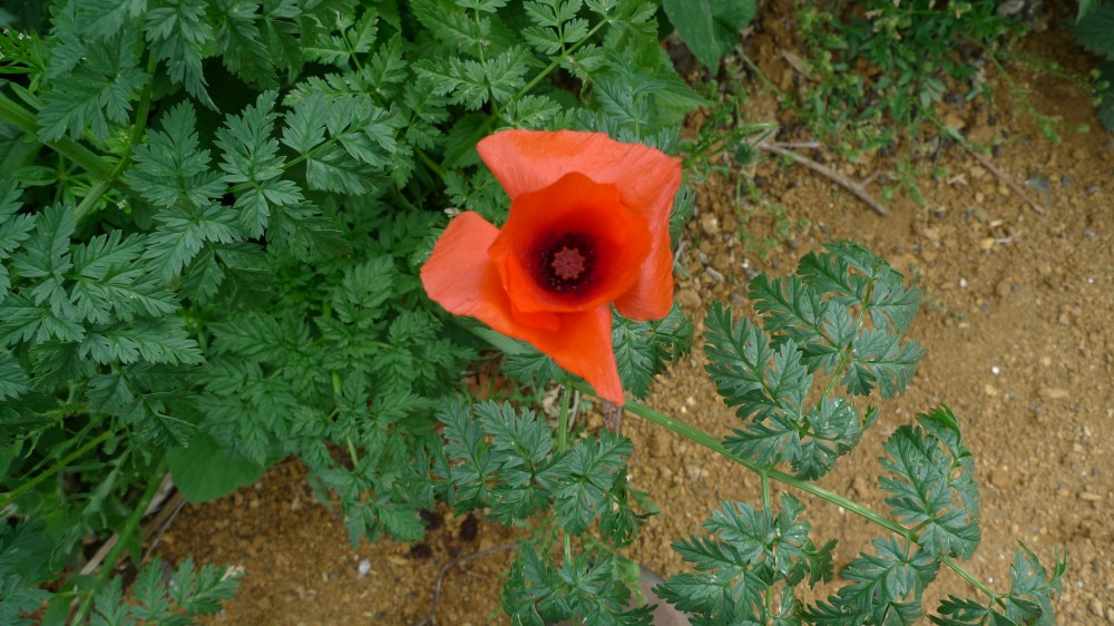 This one looked almost more like a garden poppy, but we also saw the smaller red field poppies. Field poppies only produce pollen, with no nectar. Bees are said to seek the pollen out as it is for some reason extremely attractive to them, perhaps because the poppies produce it in enormous quantities. Bees returning home with it cannot be missed as it appears quite black, but is actually a very dark purply blue on examination.