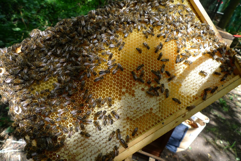All was fine and dandy in Rosemary’s hive. It took a while to get in there – they had propolised down the entire queen excluder and it took ten minutes just to prise the super off – but inside all was business as usual. Lots of bees, lots of honey, lots of brood. A rare ray of sunshine pierced through the apiary’s leafy canopy and shone on the glistening nectar of this frame.