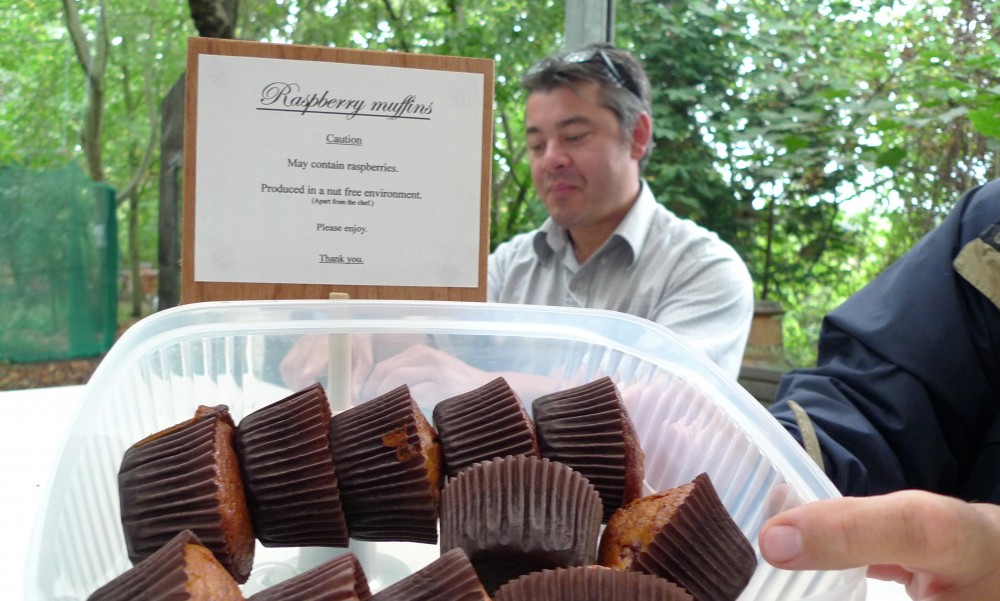 Cliff had even made us a little sign for his raspberry muffins. It denied all liability for any bad muffin-related reactions, stating ‘Caution: may contain raspberries. Produced in a nut free environment. (Apart from the chef)’. Cliff is a Geordie – you’ve got to love the northern sense of humour. Jayne had made fairy cakes, and I’d made baklava from Jayne’s London honey, so we had quite a little feast going on.