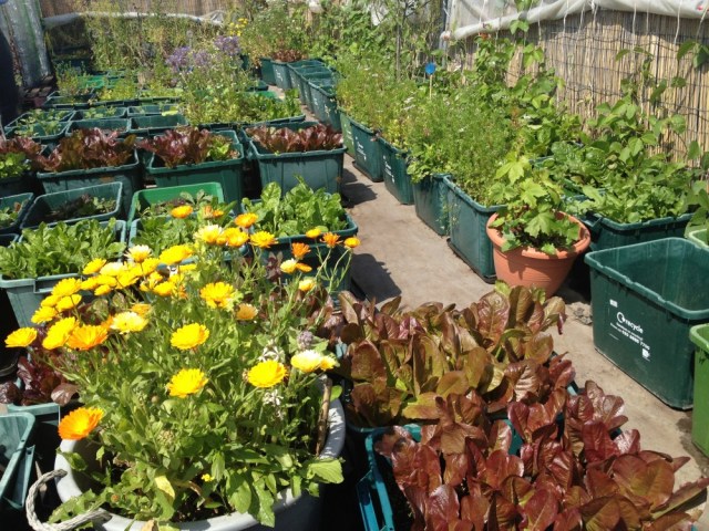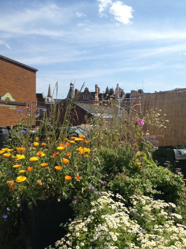 Above you can see some of the crops grown up on the Food from the Sky roof. The project has found that salad crops grow fast and sell well, so they specialise in these. During the summer they produce around 100 bags of salad a week, and in the winter 10 bags, grown in a greenhouse made of plastic bottles. They like to avoid monocrops, so a wide variety of plants are grown, some of which are just there to provide food for local bees. Sarah encouraged us to try eating the blue flowers of borage, which they slip in salad packs to add colour and prettiness. The air was humming with bumble bees going crazy for the borage.