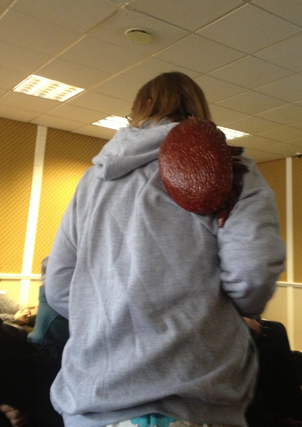 I forgot to post a photo I took from Karin Alton’s talk – of her wearing a human-sized varroa mite she had made, in proportion to the size the mite is on a bee. Imagine carrying one of these around sucking the life out of you all day.