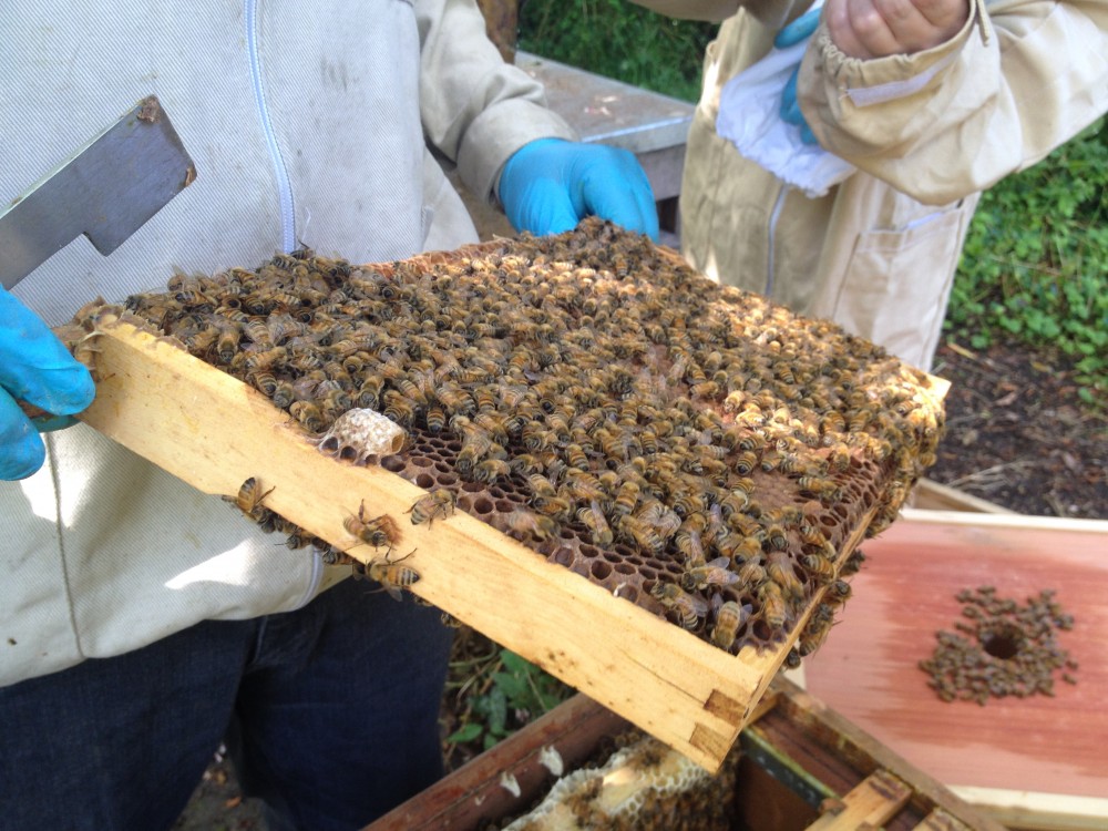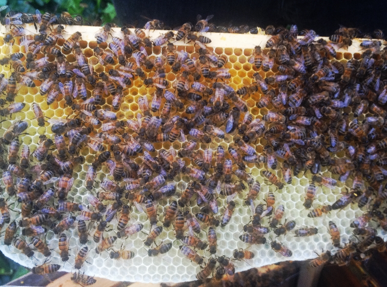 Considering she was marked and had been seen a week ago with her mark on, we came to the conclusion that she wasn’t in the hive. Although it is unusual for a colony to swarm before queen cells are sealed, perhaps the spectacular weather on Friday encouraged them to get going. Jonesie decided to take most of the queen cells down and leave a couple, to reduce the likelihood of further cast swarms from the already depleted colony.