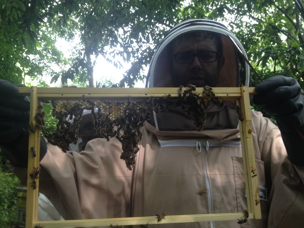Here’s Jonesie holding up one of his foundationless frames. It’s interesting to see how the bees begin building. To produce wax, worker bees older than 10-12 days old eat nectar and hang in chains; this raises their body temperature and causes their eight wax glands on the underside of their abdomens to secrete tiny flakes of wax. They then chew the wax and manipulate it into the precise shapes of comb using their mandibles and forelegs.