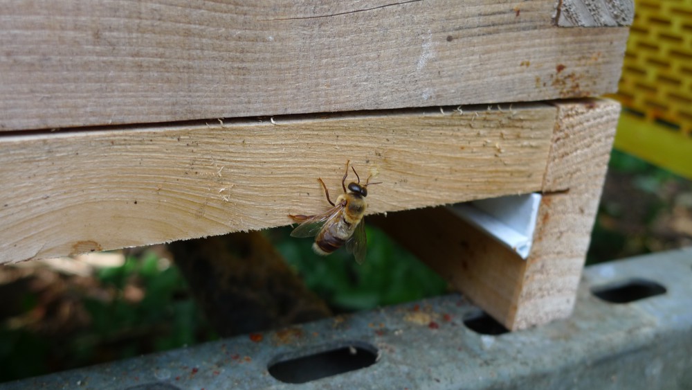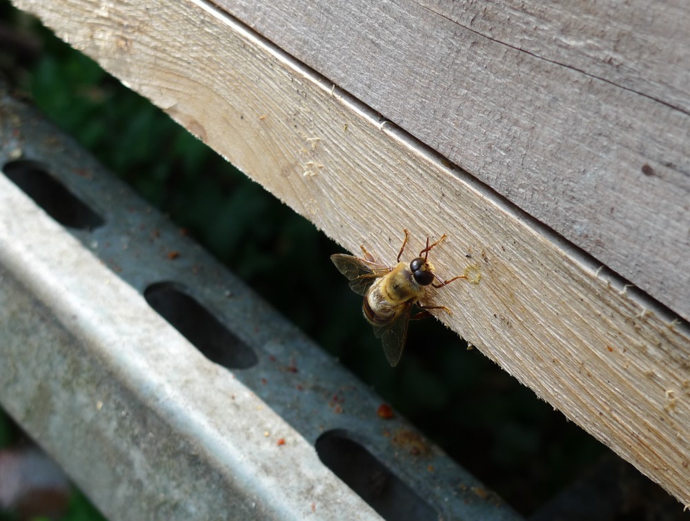 There are few drones left now. John Chapple was going around with a bottle – he collects them to sell to a Chinese restaurant. The restaurant wants 500 drones a week, but John is struggling to find that many at this time of the year. After visiting all the hive entrances, he told us he’d collected 109.