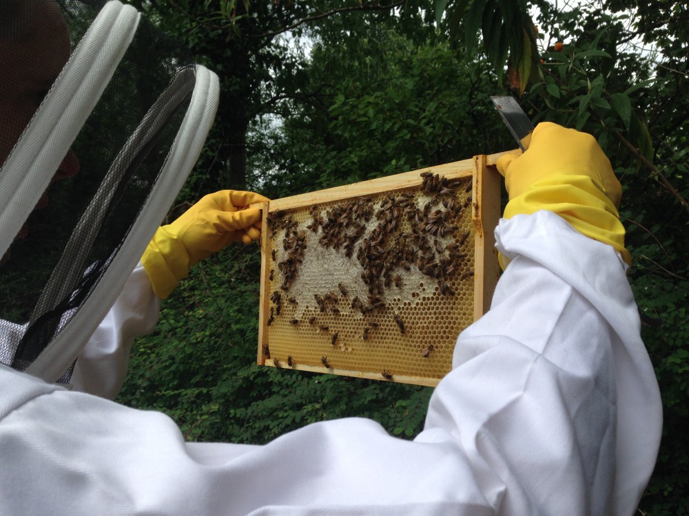 I still inspected without gloves or smoke, but I could sense a change in mood, without the calming effect of open brood pheromones they were more buzzy and irritable than in the past. They also have more honey to defend now. Above you can see them hard at work in the super. It’s not all capped yet but all the frames have been filled and it’s mighty heavy to lift off.