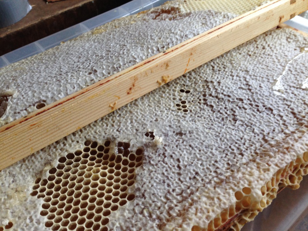 The honey you can see oozing out above is lighter honey from our apiary hives. Emma has some more photos of the extraction at http://missapismellifera.com/2015/07/25/a-beekeepers-notes-for-july/