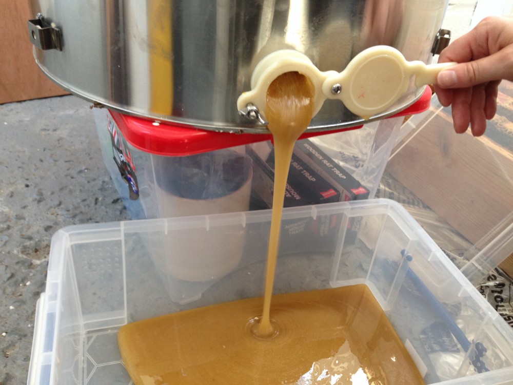 Much to our relief, the answer was yes. We took turns cranking the handle around, with Emma’s boyfriend John joining in at one point too. A tiring job but at least we could see results as the honey gradually built up at the bottom of the extractor. We drained the extractor after every super of frames, as it can only be used whilst on the floor and then must be lifted up onto a surface so that the honey can flow into a container below. If you extract too much honey before draining it, the extractor will be extremely heavy/impossible to lift!