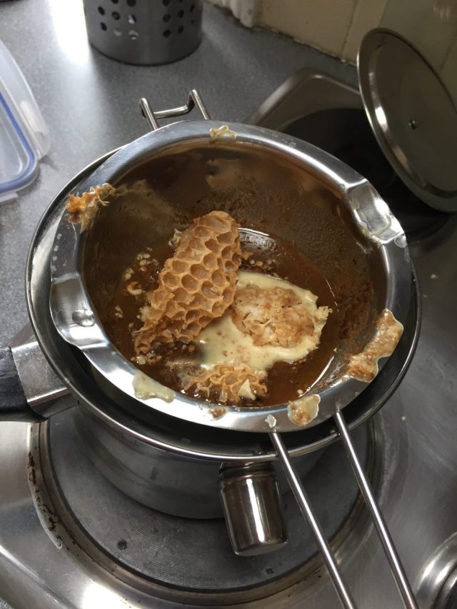 Well, I had some time off recently and Tommy was in nursery. So I finally had no excuse to put it off any longer. With the help of the brilliant book ‘‘The Bee Book‘ (co-written by several talented beekeepers including Emma Sarah Tennant) I improvised… not quite in the right way… but the wax did melt!
