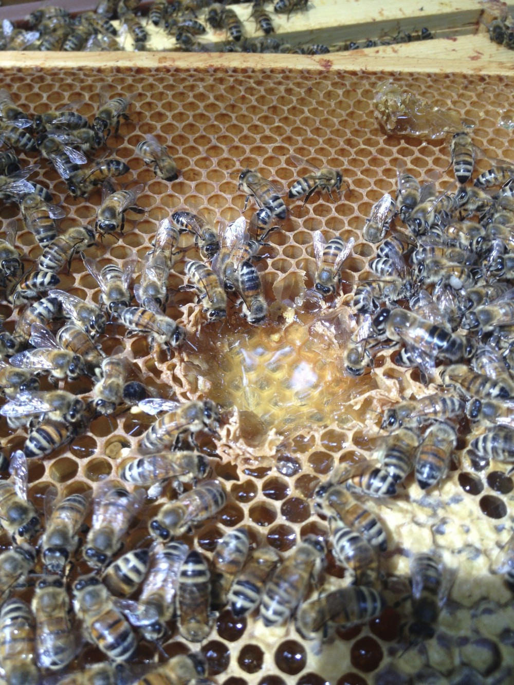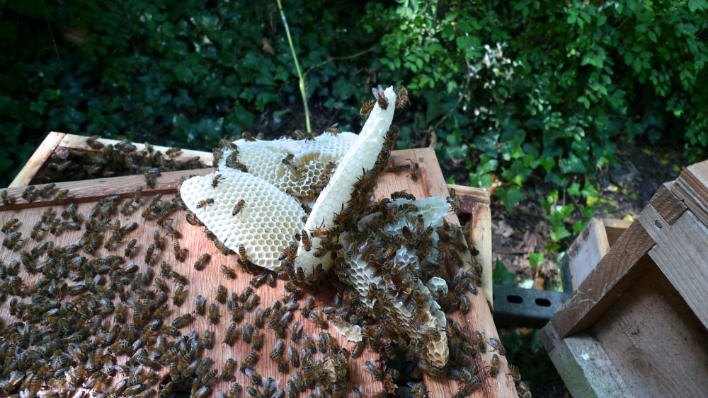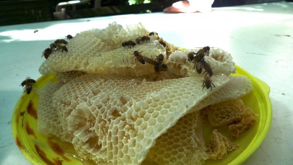 What is a bee house? Mr Badger has designed a large shed with several hives kept inside. Gaps at the top of the shed allow the bees to fly out; air being allowed to circulate in all the time prevents the problem of the bees thinking it’s warmer outside than it really is. It’s a more complex and clever design than that, but not being a practical person I’m afraid I can’t recall the finer details. He emphasised the importance of keeping the bee house clean, not dropping any wax or honey on the floor, and indeed it did look most spick and span.