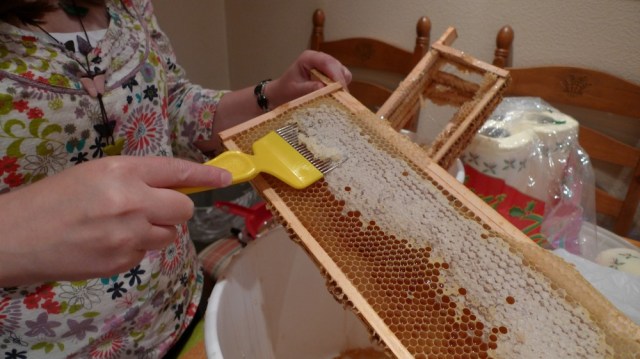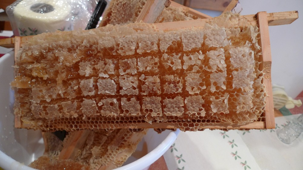 We had created a space above the brood box using an empty super and then put another super on top with a few super frames we didn’t harvest. The gap makes them see the super as not part of their hive, so they go up and rob it, storing the honey in the brood box. We want them to be on just the single brood box over winter, which is the convention in the apiary, though I think there are arguments in favour of double brood boxing or brood-and-a-halfing a strong colony. Below you can see the ladies eagerly lining up round a few chunks of honey we cut out from the now otherwise cleaned out super box.