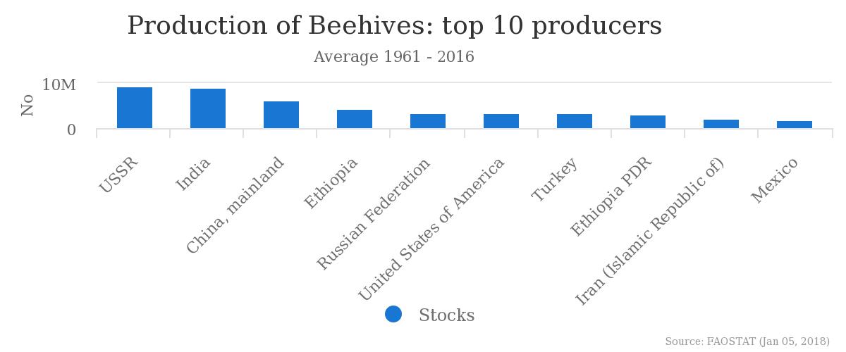 © FAO, Production of Beehives by country 1961-2016, Web address: http://www.fao.org/faostat/en/#data/QA/visualize, Accessed: 05/01/18